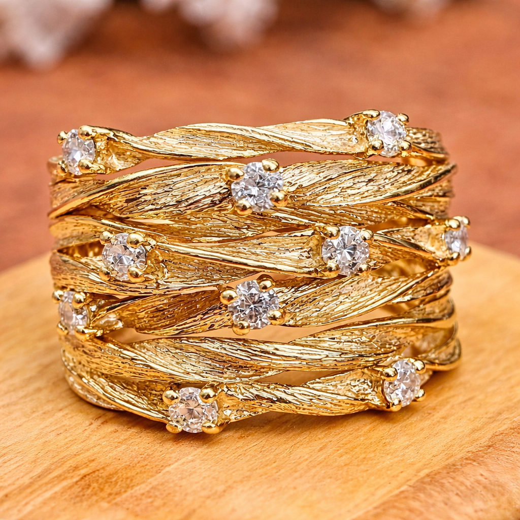 Οι διαδοχικές στρώσεις σε χρυσό συνδυάζονται αρμονικά με διακριτικές πέτρες, δημιουργώντας ένα αποτέλεσμα που τραβά τα βλέμματα και αναδεικνύει κάθε εμφάνιση.